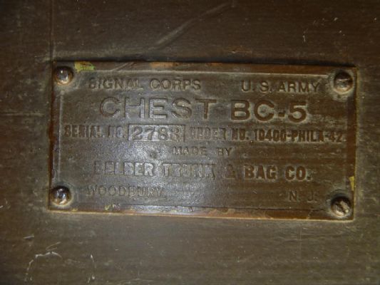 The label content is: SIGNAL CORPS U.S ARMY CHEST BC_5 SENIAL NO.2783 QRBER NO.10400 PHILA-42 MADE BY BELBER TRUNK & BAG CO. WOODBURY N.J signal coprs u.s army U.S. Army Signal Corps chest bc_5 may be May represent control or container 5, indicating that this device is used in combination with several things. SENIAL NO.2783 QRBER NO.10400 PHILA-42 (may be the technical parameter code of the device, the details are unclear) MADE BY Manufacturer BELBER TRUNK & BAG CO. Company name WOODBURY N.J Woodbury (city): New Jersey (New jersey) N J Reminder: Do not rush to remit money or pay a deposit before seeing the real thing to avoid being cheated. 2013101102629215 2013101102639744 2013101102650793 2013101102657189 201310110279391