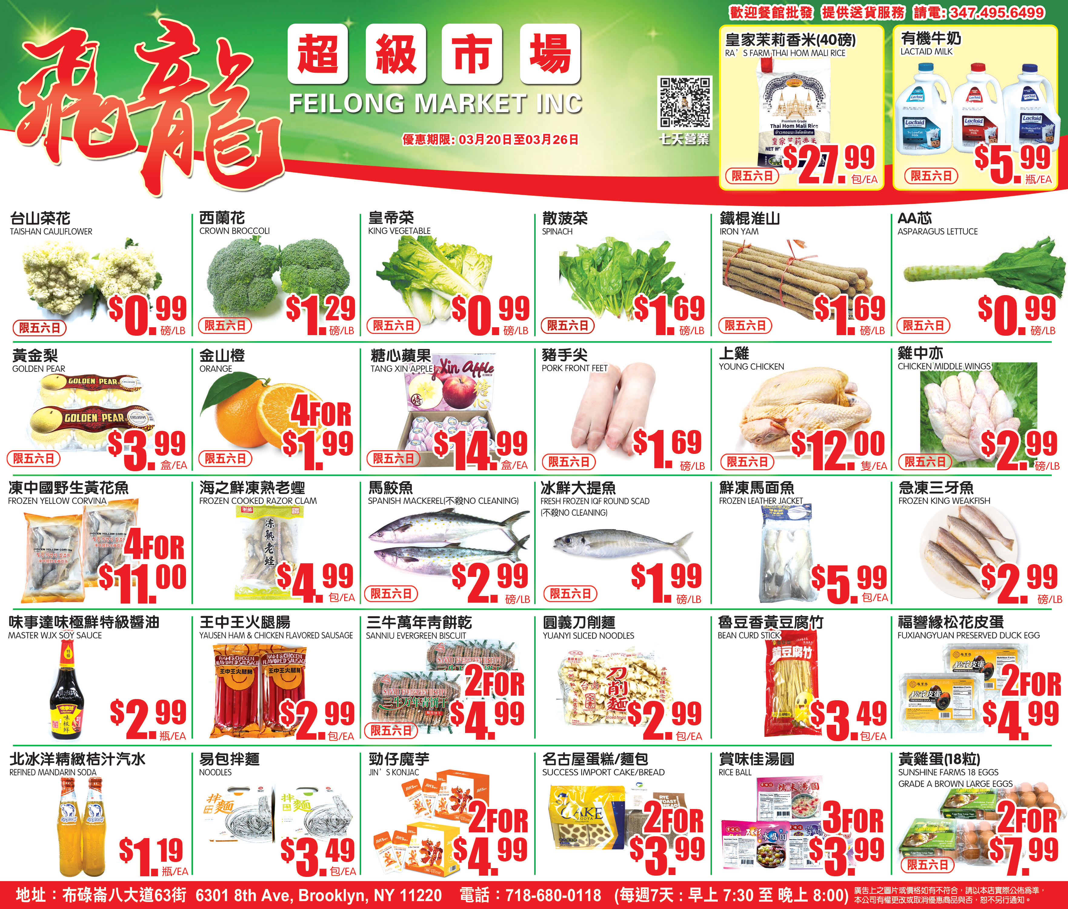 飞龙超级市场货品齐全,一定能满足来自各地客人的需求,受到热烈欢迎。飞龙超级市场本着货品真材实料,价钱好,服务好,地点好,顾客至上,方便客人,赢得广大顾客的信赖与支持。现该店有广告箱出租,有意者可致电1(718)680-0118洽询。每周七天营业。