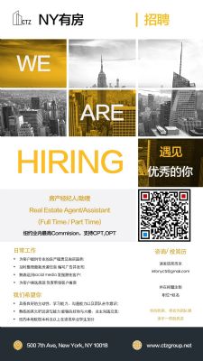 【Yuki Team】Real estate agency is recruiting new members! ! Part Time/ Full Time Complete the company training program. Elite Leader personally guides [Daily work] Provide professional real estate leasing and purchasing services to customers; timely organize the latest housing information, write advertisements and publish them; skillfully use social media to discover potential customers; select housing for customers and lead customers to view houses; [We hope you] have good initiative, learning ability, communication skills and teamwork awareness; proficient in English listening, speaking, reading and writing skills Able to communicate well with the building and owners; extra points for those who are currently studying or graduating from local New York colleges and universities; 1) Generous salary, the highest commission percentage in the New York market 2) Support for CPT/OPT performance, outstanding performance, support for H1B 3) Super loving and warm team to take you to New York. Interested candidates + WeChat/ Send your resume to: Name + Application Reminder: Do not rush to remit money or pay a deposit before seeing the real thing to avoid being cheated.