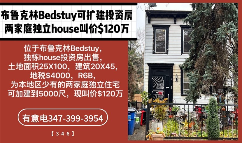 布鲁克林Bedstuy可扩建投资房。独立两家庭120万
