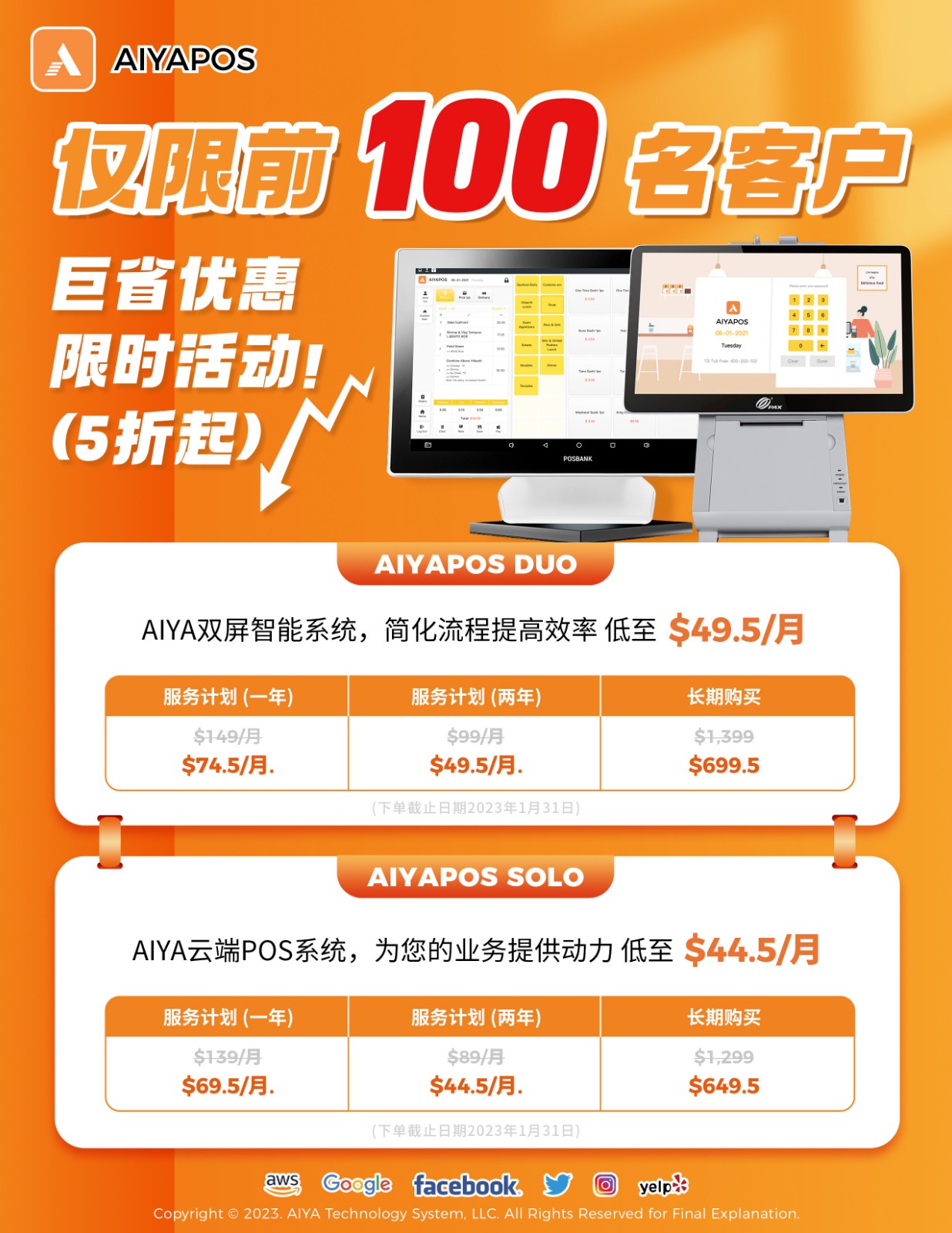 中英双语切换同步,沟通高效无障碍,运营效率稳步提升 餐厅数据及时备份,优化餐厅经营,提供完整数据支持 订单自动同步,减少客户等候时间,商家无需反复核对 多种配套设备助力餐厅经营,一站式出单打印,减少人力成本投入 AIYA智能双屏系统 🔗 AIYA云端POS系统 活动截止至2023年1月31日 更多资讯,请拨打电话888-622-0811 提醒:未看见实物之前不要急着汇款或交保证金避免受骗。 美食-娱乐-旅游相关图片