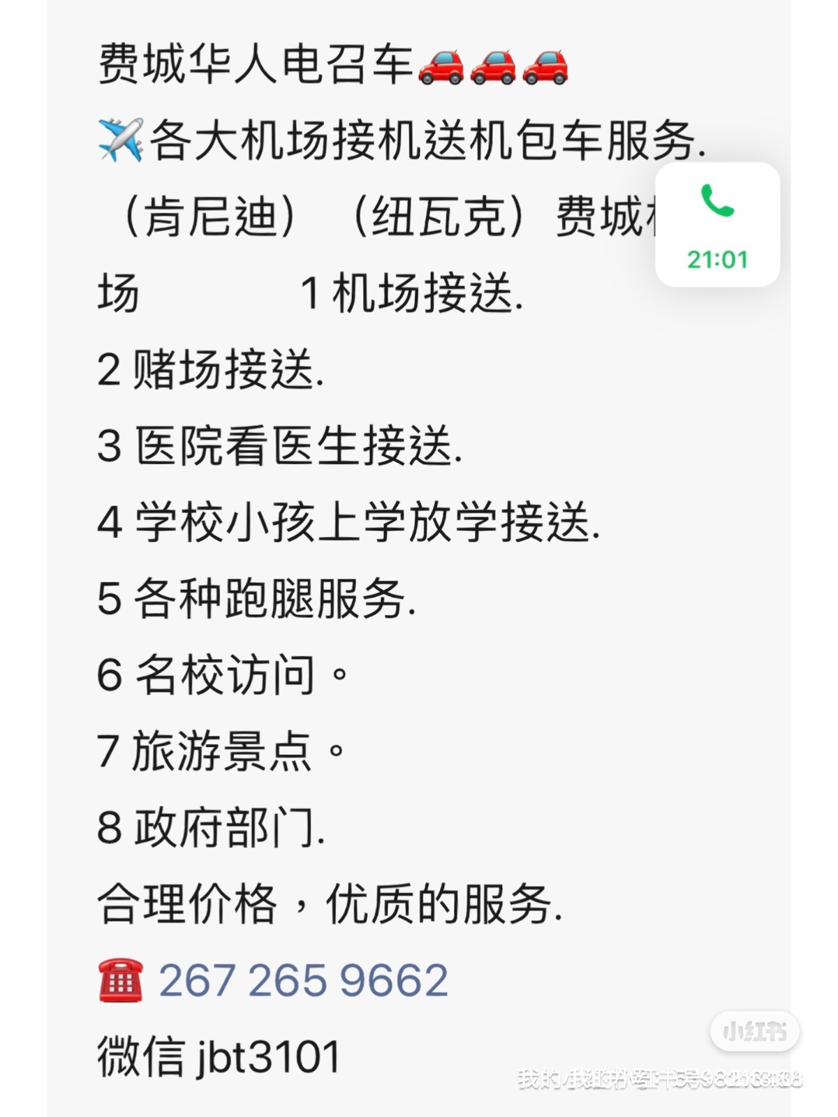 ☎️ 267 265 9662 微信 jbt3101 ✈️各大机场接机送机包车服务 肯尼迪JFK 纽瓦克EWR 拉瓜地LGA 3⃣️ 🏥医院看医生接送 4⃣️ 🏠政府部门办事接送 5⃣️ 🏫名校访问接送 6⃣️ 🏖旅游景点接送 7⃣️ 🏫学校小孩上学放学接送 8⃣️ 🏃各种跑腿服务 9⃣️🚘小型搬家 ☎️ 267 265 9662 微信 Jbt3101 提醒:未看见实物之前不要急着汇款或交保证金避免受骗。